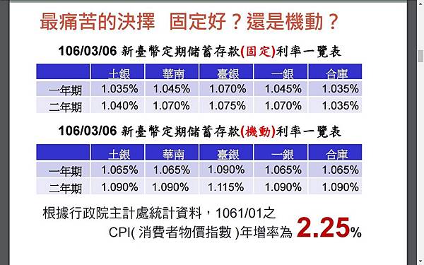 不用看那些定存利率了,重點是下面的CPI年增率2.25%
